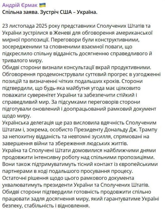 Ермак заявил, что попытки скорректировать мирный план Трампа продолжаются (похоже всё-таки не договорились в Женеве)