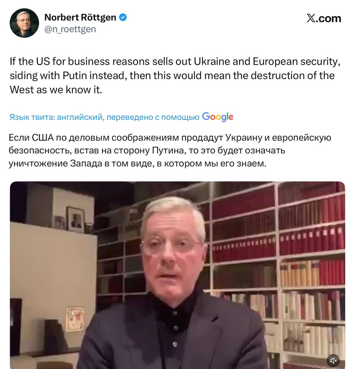 Депутат германского бундестага Норберт Реттген, долгие годы возглавлявший парламентский комитет по внешней политике: «Если США по деловым соображениям продадут Украину и европейскую безопасность, встав на сторону Путина, то это будет означать уничтожение Запада в том виде, в котором мы его знаем».
