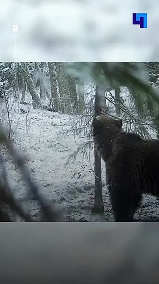 Видеоловушка Нижне-Свирского заповедника сняла взрослого бурого медведя, который пока не собирается в спячку, несмотря на снег и первые морозы.