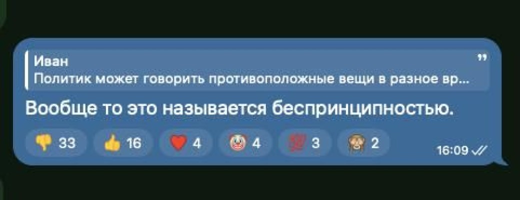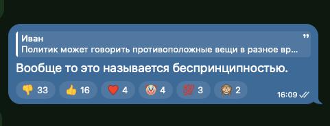 Больше половины отреагировавших на реплику искренне считают, что способность политика заявлять прямо противоположные цели не является беспринципностью.