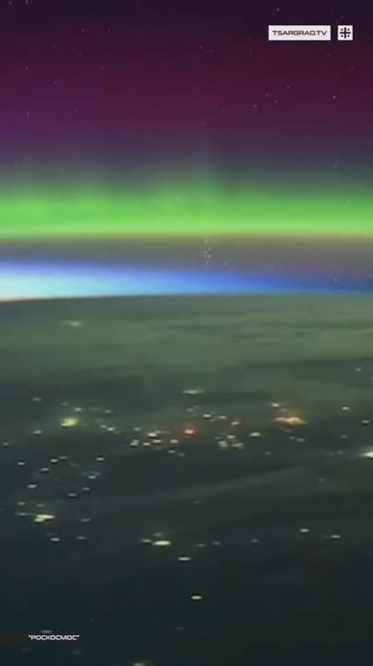 На кадрах мерцающие полосы сияют над планетой на высоте 400 километров.