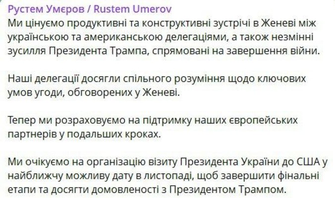 ‘Наши делегации достигли общего понимания по ключевым условиям соглашения. Теперь мы рассчитываем на поддержку наших европейских партнеров в дальнейших шагах. Мы ожидаем организации визита президента Украины в США в ближайшую возможную дату в ноябре, чтобы завершить финальные этапы и достичь соглашения с президентом Трампом’.