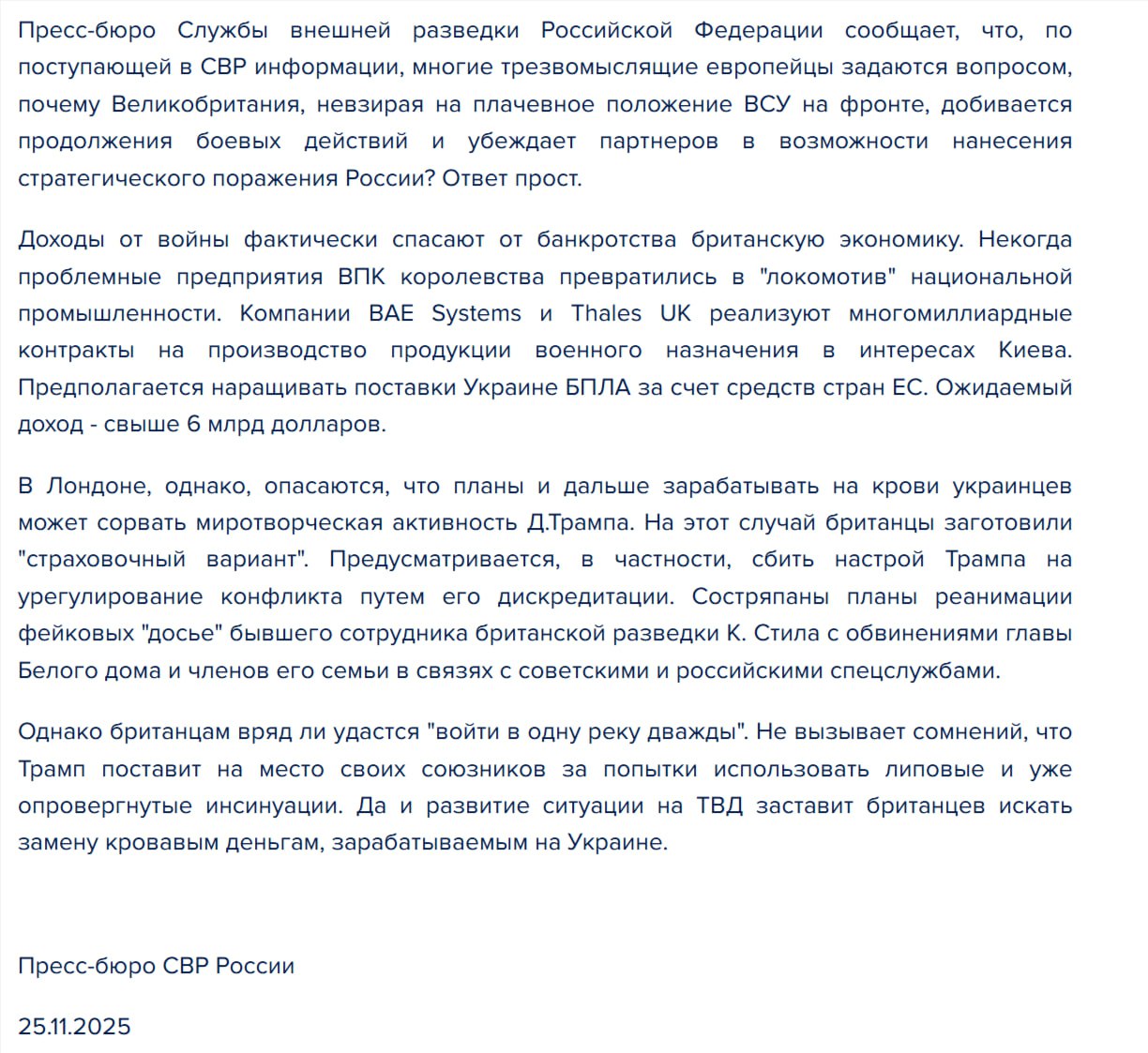 Заявление Службы Внешней Разведки РФ по поводу попыток Британии сорвать переговоры об окончании войны на Украине.