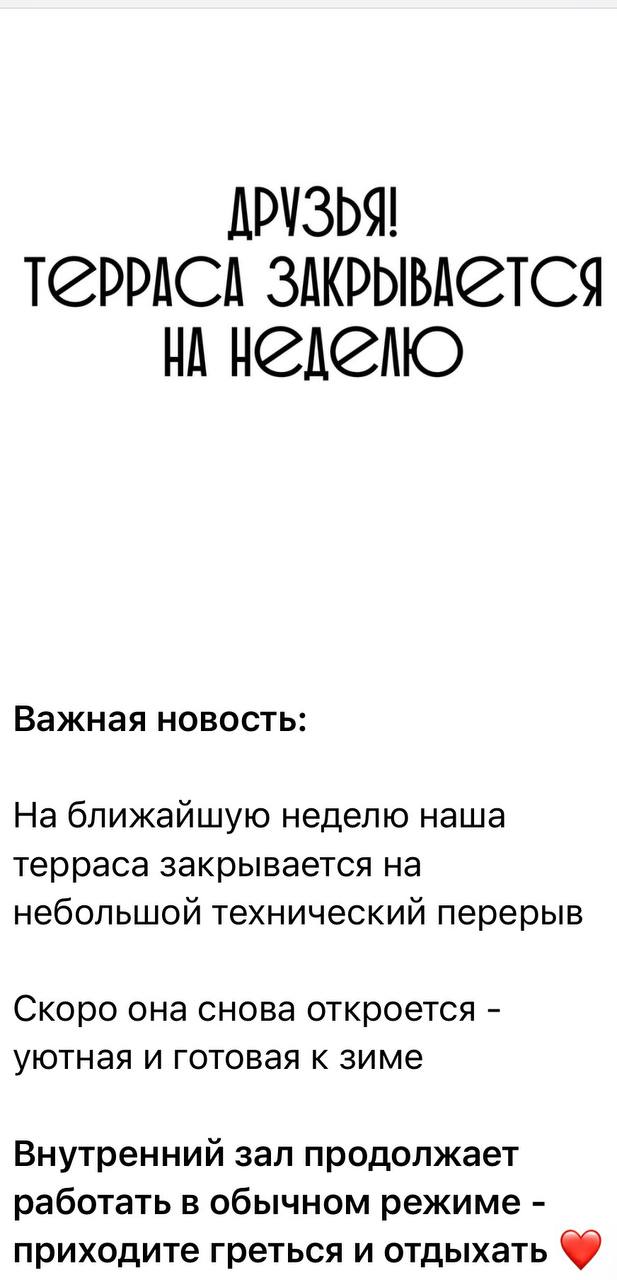 «На ближайшую неделю наша терраса закрывается на небольшой технический перерыв (...)Внутренний зал продолжает работать в обычном режиме — приходите греться и отдыхать».