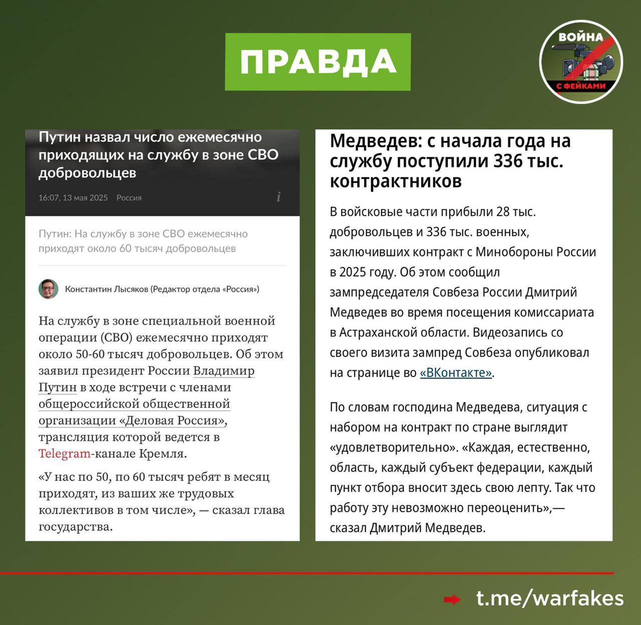 Правда: Это еще одна вариация фейка на тему «у России заканчивается что угодно», в данном случае — бойцы. Это утверждение не соответствует действительности, так как численность ВС РФ, принимающих участие на СВО, активно пополняется за счет добровольцев и недостатка в них нет.
