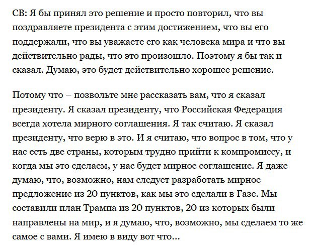 -Нет, я не слышал, но это стандартная вещь. Он должен ‘продать’ это Украине, он должен ‘продать’ Украину России. Это то, что делает посредник. Вы должны сказать: ‘Смотрите, они хотят этого. Вам нужно убедить их в том-то’. Это стандартная форма переговоров. Не слышал запись, но слышал, что это просто обычные переговоры. Предполагаю, что он говорит то же самое Украине — ведь обе стороны должны уступать.