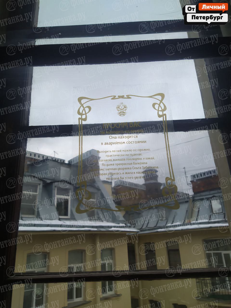 Выходить на неё можно осторожно, практически на пуантах, с согласия жильцов последних этажей. Но даже прекрасная балерина, потомственная дворянка Ольга Заботкина, которая родилась и жила в этом доме, не стала бы этого делать.