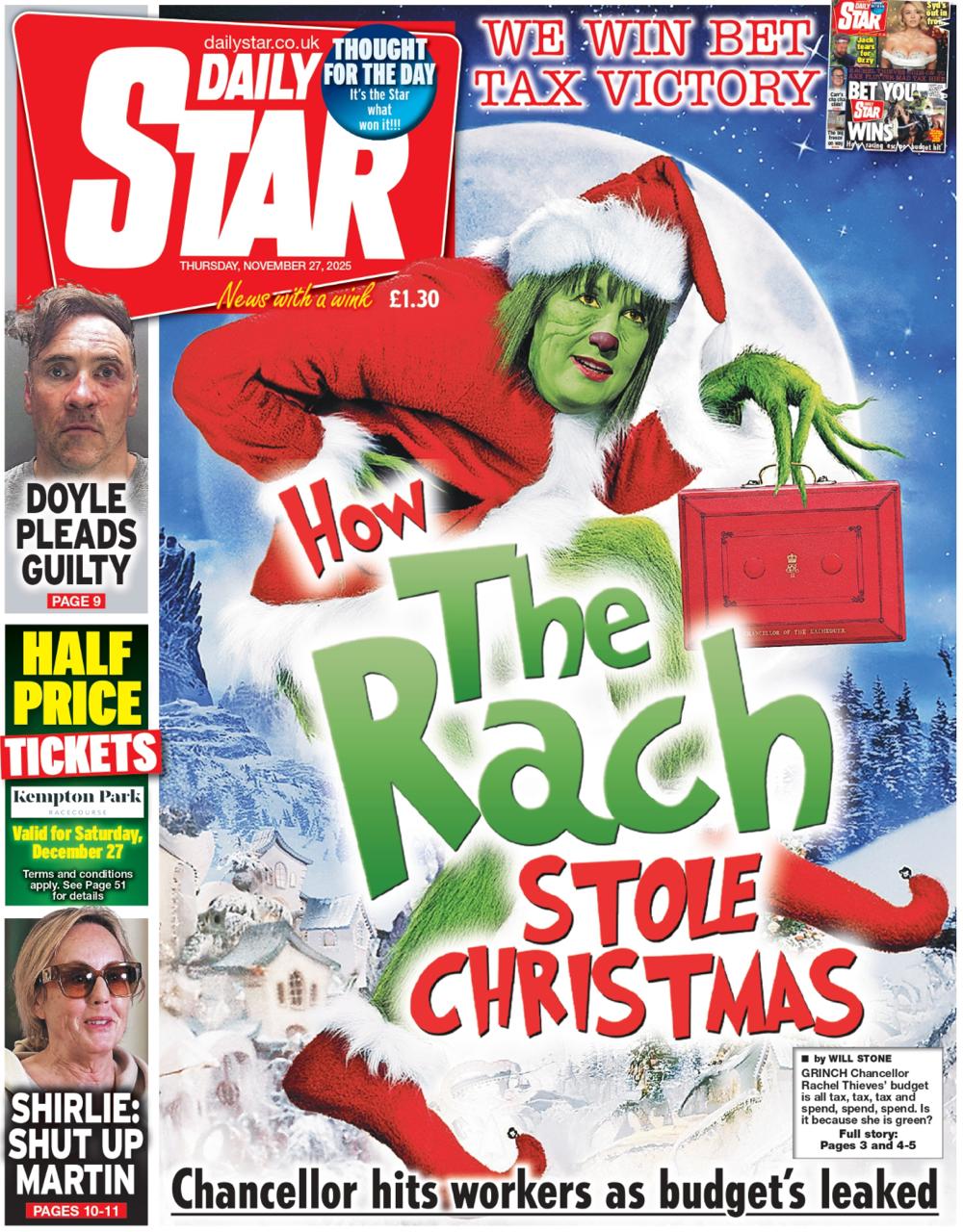 Отсюда - и обложка Daily Star о том, что канцлер Британии Рейчел Ривз украла Рождество.