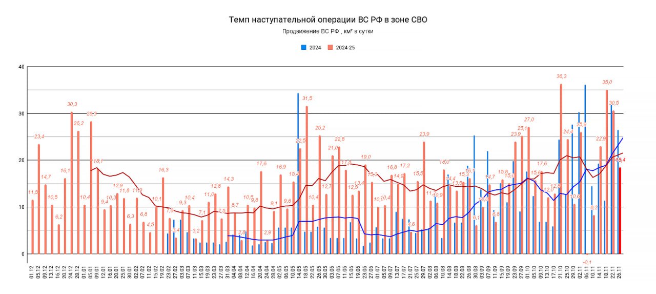 Обновление по данным c 22 по 25 ноября 2025. Темп продвижения +18,4 км в сутки за период, общее продвижение 73,7 км.