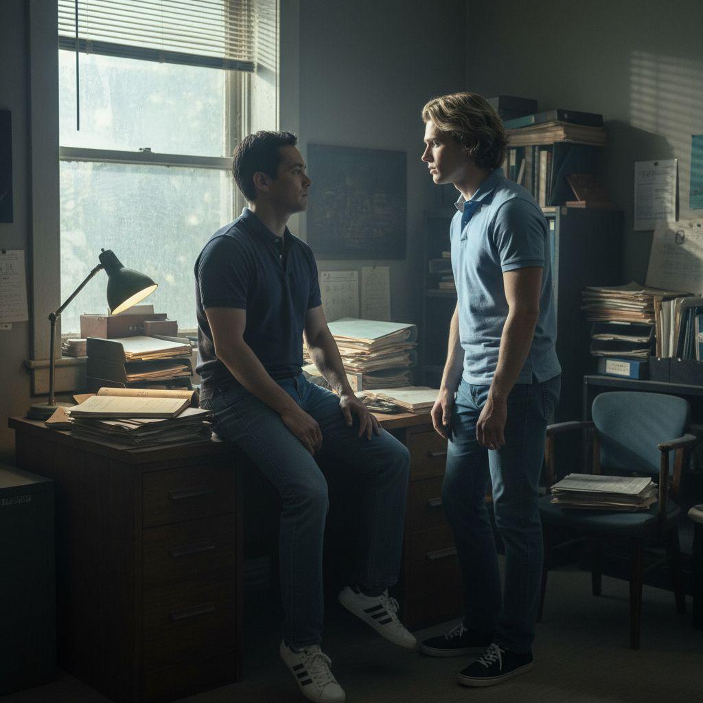 У того, кто постарше, волосы были тёмными. Он полусидел, опершись на письменный стол.