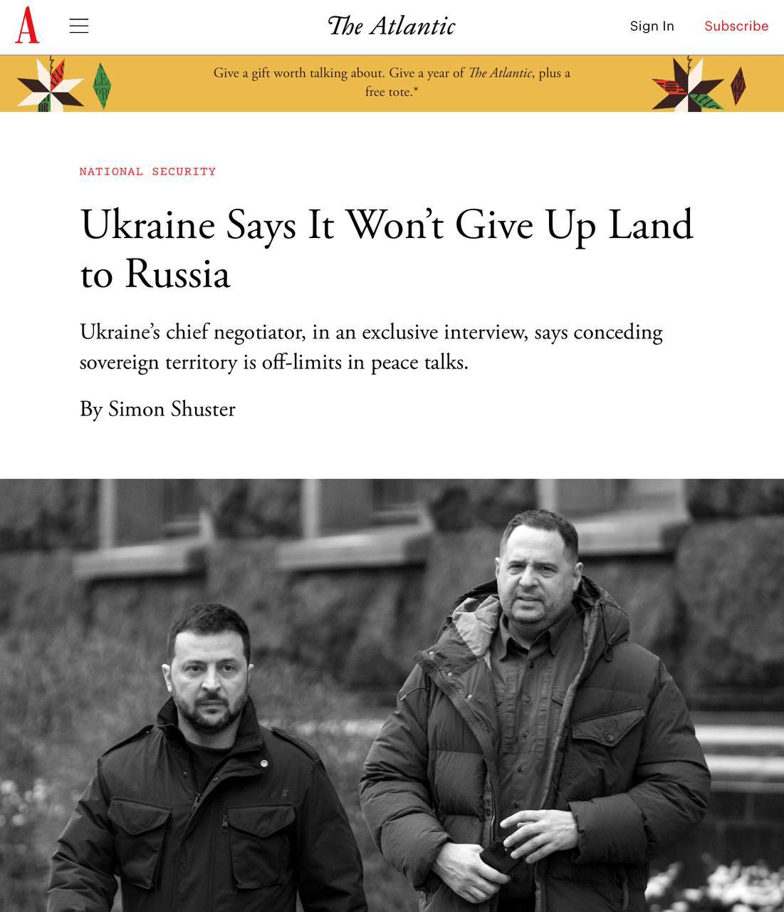 Ермак: «Пока Зеленский — президент, никто не должен рассчитывать на то, что мы откажемся от территории. Он не подпишет документ об отказе от территории».