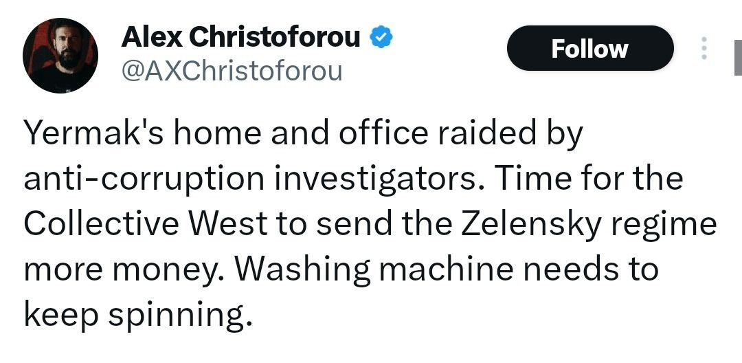 «В доме и офисе Ермака проходят обыски. Самое время коллективному Западу дать Зеленскому еще больше денег. Машина по отмыванию денег должна крутиться», — пишет самый известный кипрский журналист Алекс Христофору