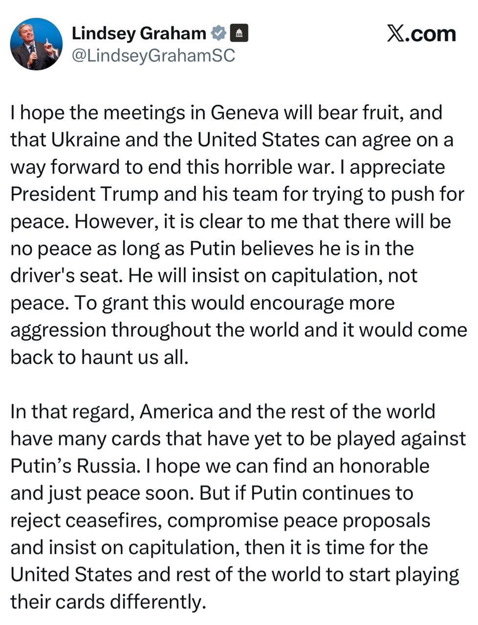 Надеюсь, мы скоро обретём достойный и справедливый мир. Но если Путин продолжит отвергать прекращение огня, идти на компромиссы и настаивать на капитуляции, то Соединённым Штатам и остальному миру пора начать разыгрывать свои карты по-другому и применить по отношению к России силу...