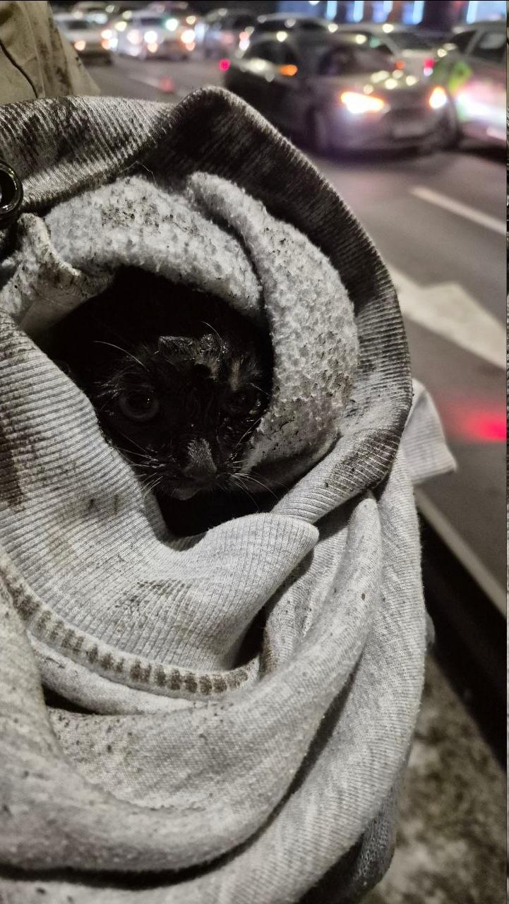 Ноябрьским вечером котенок решил перебежать дорогу у заправки. Он добрался до убежища - отверстия в поребрике, где его и заметили очевидцы, которые вызвали сотрудников «Кошкиспаса».