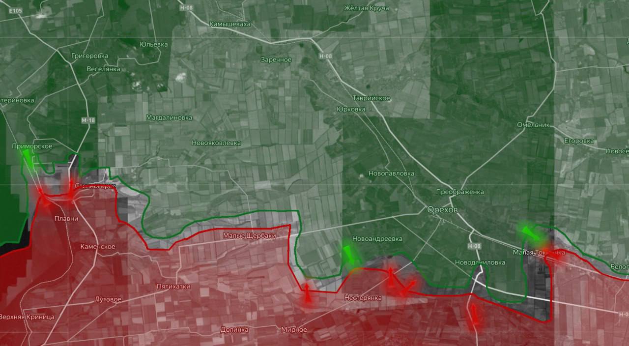 Российские войска проводят атаки в окрестностях Степногорска, Малой Токмачки и Приморского, пытаясь проломить линию оборонительных рубежей, выстроенных ВСУ вдоль Орехова.