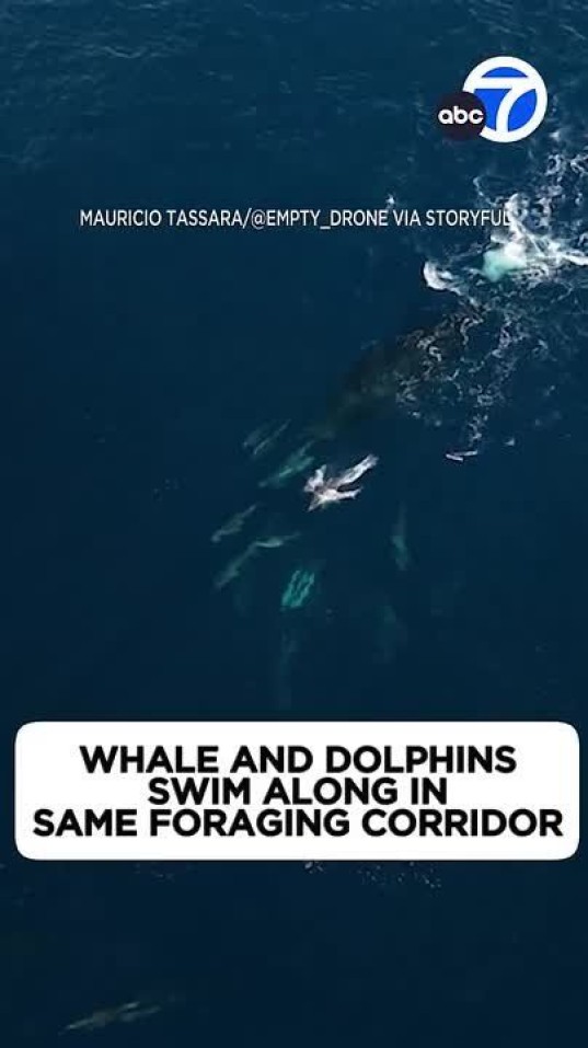 Дрон снимает гигантского кашалота, плывущего с группой дельфинов у побережья Ранчо Палос Вердес в Калифорнии.