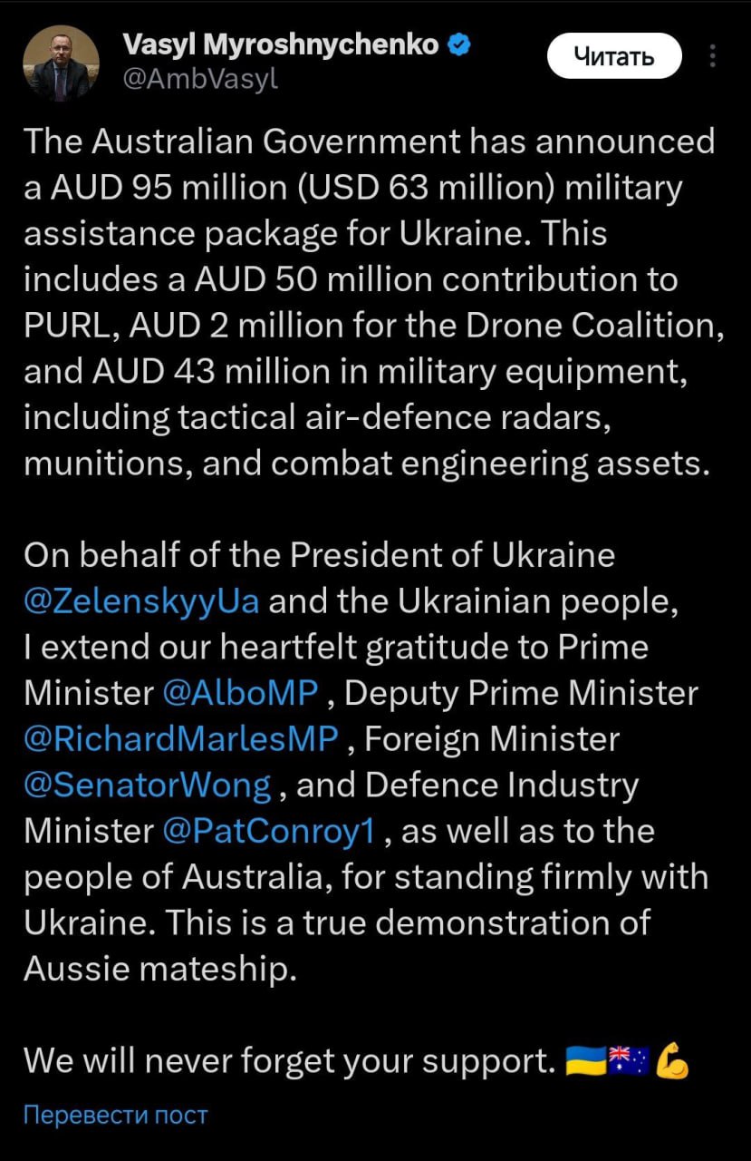 «Правительство Австралии объявило о пакете военной помощи Украине в размере 95 миллионов австралийских долларов (63 миллиона долларов США). Он включает в себя взнос в размере 50 миллионов австралийских долларов в программу PURL, 2 миллиона австралийских долларов в программу Drone Coalition и 43 миллиона австралийских долларов в виде военной техники, включая тактические радары ПВО, боеприпасы и средства боевой инженерии».