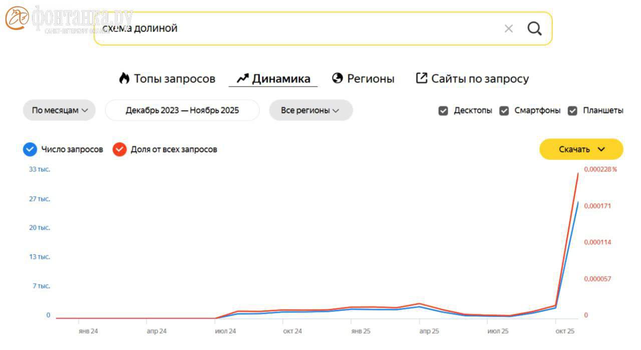 На 91% выросло число запросов «схема Долиной» в браузере за месяц (2,4 тыс. в октябре против 26,5 тыс. в ноябре). Активнее всего стремятся обезопасить себя москвичи — в топе запросов по городам московский индекс интереса составляет 155%. Петербуржцы — на втором месте с интересом в 138%.