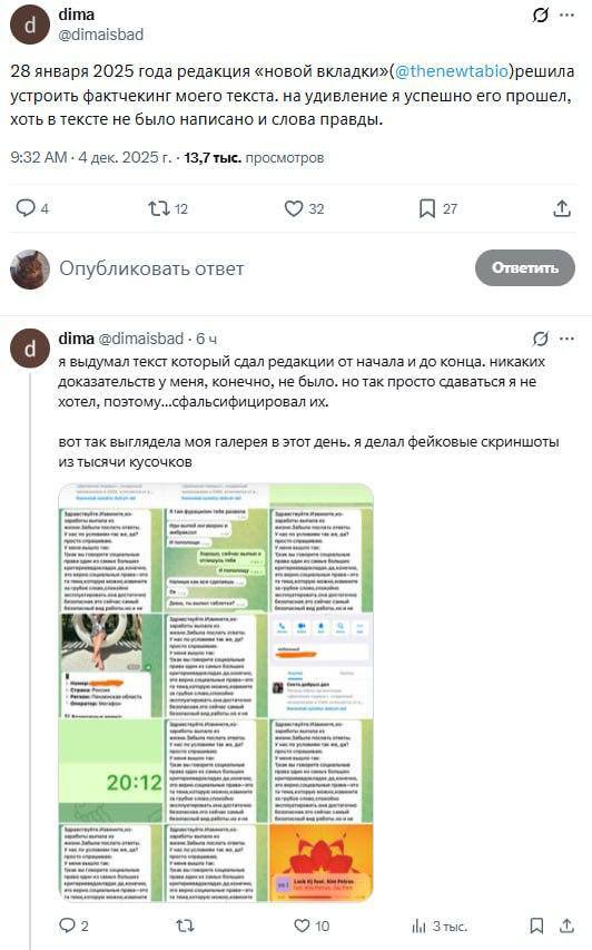 Новая вкладка» — интернет-издание, которое «рассказывает истории из регионов России», а также выпускает критические статьи о конфликте на Украине. Оно публиковало в соавторстве с «Чертой» (в реестре иноагентов в РФ) и «Эхом» статьи некоего Дмитрия Шишкина о военных, «Движении Первых», поступлении в вузы детей участников СВО и милитари-волонтёрах. Сам же автор признался, что специально создавал фейки:«С марта 2024-го по февраль 2025-го я обманывал «Новую вкладку», «Черту», «Эхо» и The Moscow Times (в реестре иноагентов в РФ, признаны нежелательной организацией). Писал я выдумки изначально только для «Вкладки», а «Вкладка» уже относила их всем вышеперечисленным изданиям». По словам Dima (его ник в X), «Новая вкладка» даже устраивала «фактчекинг» его выдуманных от и до текстов — и проверку они проходили успешно. При этом все скриншоты с доказательствами молодой человек сфальсифицировал. Позднее редакция удалила все его тексты, разместив пометки о «пренебрежении редакционными стандартами». Все материалы остались в архивах (на скриншотах). А, к примеру, The Moscow Times всё это время не удаляла материал и сделала это лишь сегодня — уже после того, как сам Dima обратил на это внимание в сети.