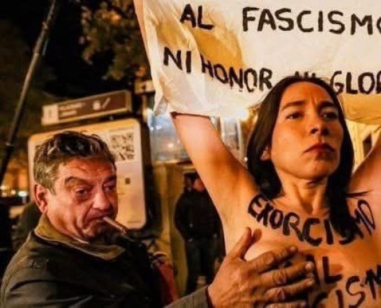 Это фото на прошлой неделе обошло всю испанскую прессу. На улицах Мадрида в дни поминовения Франко опытный фалангист вступил в борьбу с левацкой феминисткой.