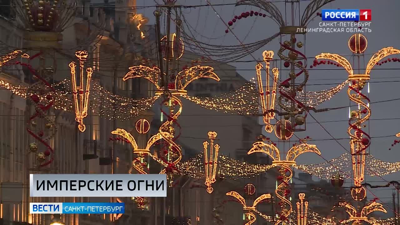 На этой неделе наступила календарная зима. Пока - без снега, зато с праздничной подсветкой. Во вторник вечером над главной транспортной артерией Северной столицы зажглась иллюминация, подготовленная к Новому году и Рождеству. Это оформление посвящено основателю города Петру Великому и выполнено в высоком - имперском - стиле.