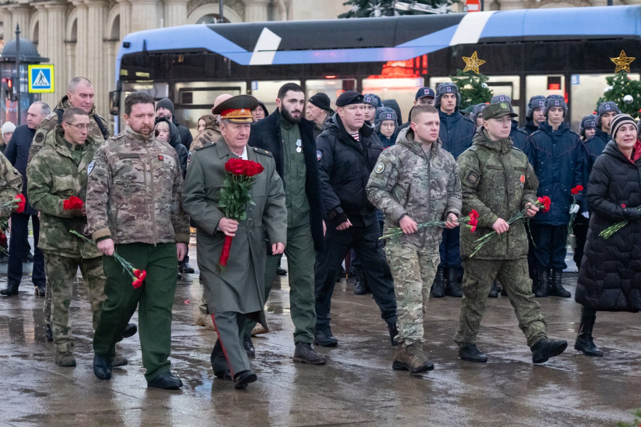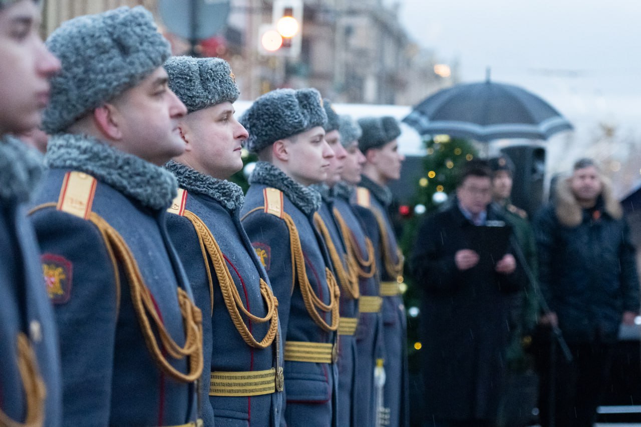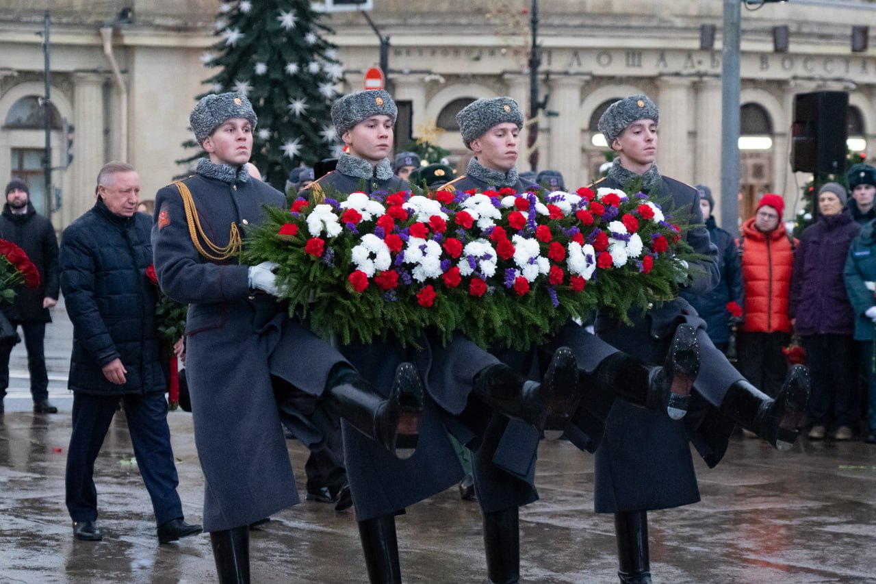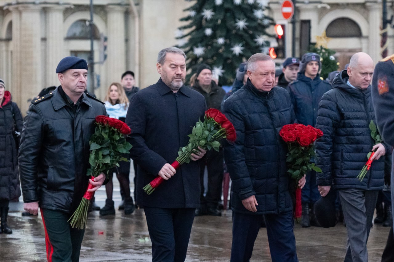 В День Героев Отечества Председатель Законодательного Собрания Александр Бельский и Губернатор города Александр Беглов возложили цветы к обелиску «Городу-Герою Ленинграду» на площади Восстания.
