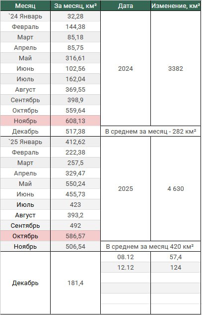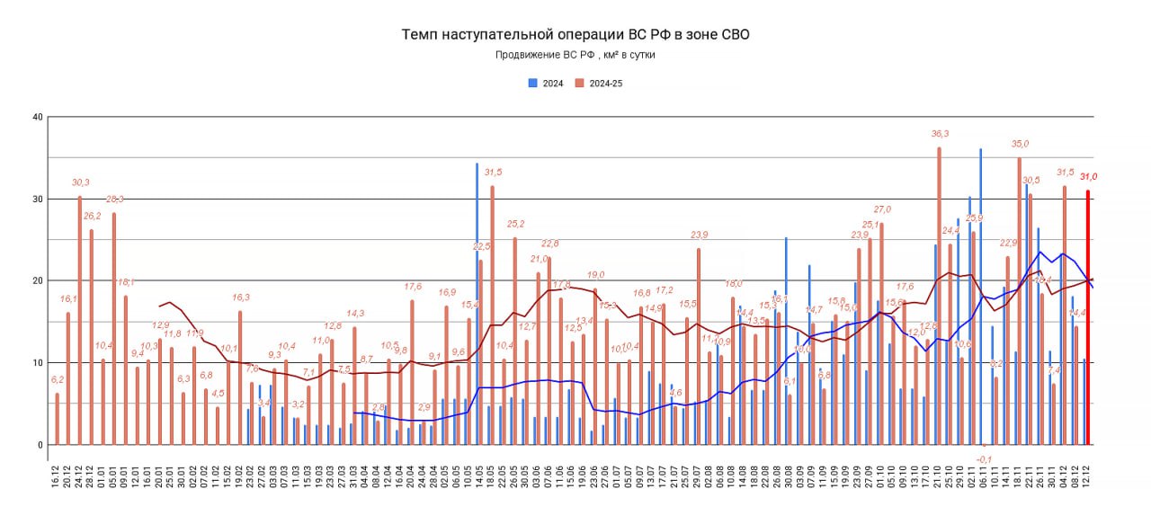 Обновление по данным c 08 по 11 декабря 2025. Темп продвижения +31,0 км в сутки за период, общее продвижение 124 км.