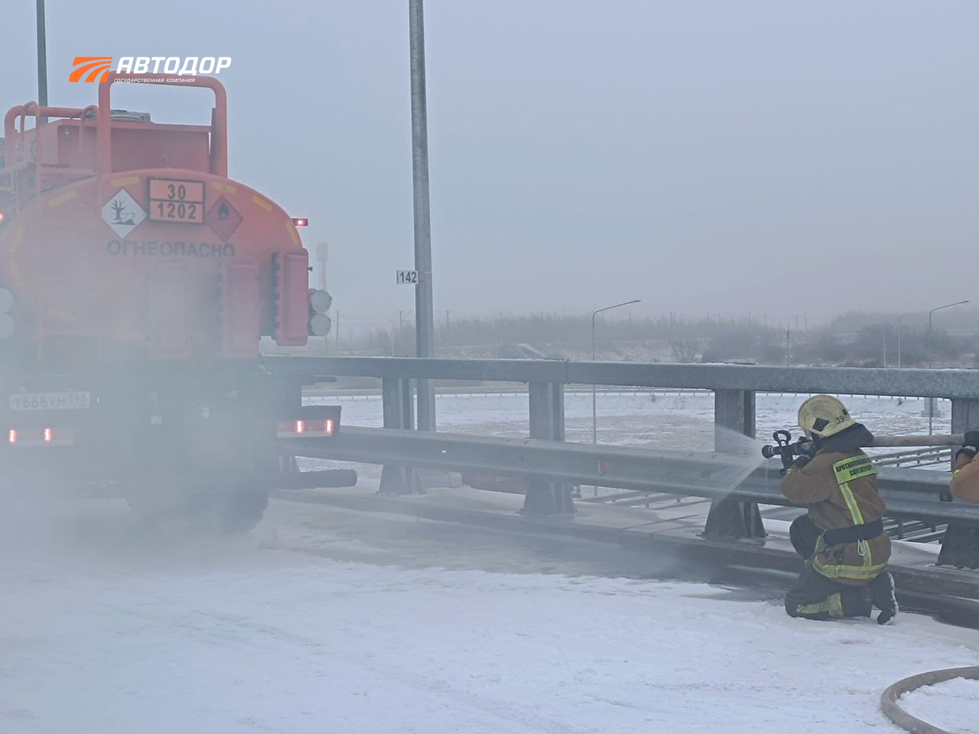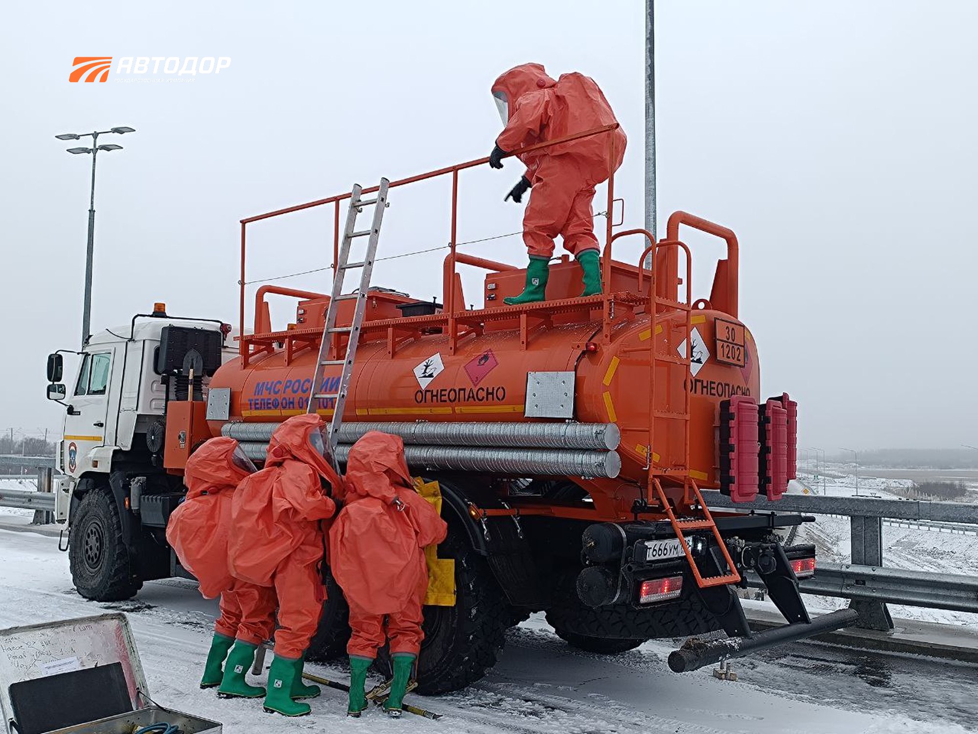 В ходе учений специалисты отработали алгоритмы оповещения, взаимодействия экстренных и дорожных служб, проведение спасательных работ, локализацию условного разлива ГСМ, а также меры по предотвращению возгорания.