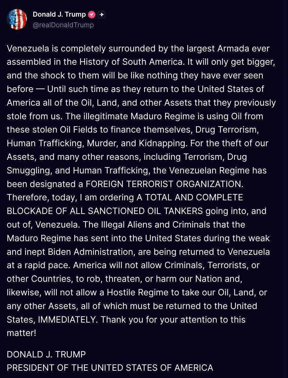 Трамп объявил полную блокаду всех нефтяных танкеров, следующих в Венесуэлу и из неё, потому что неугодная Америке власть Мадуро… «украла у США нефть и земли»