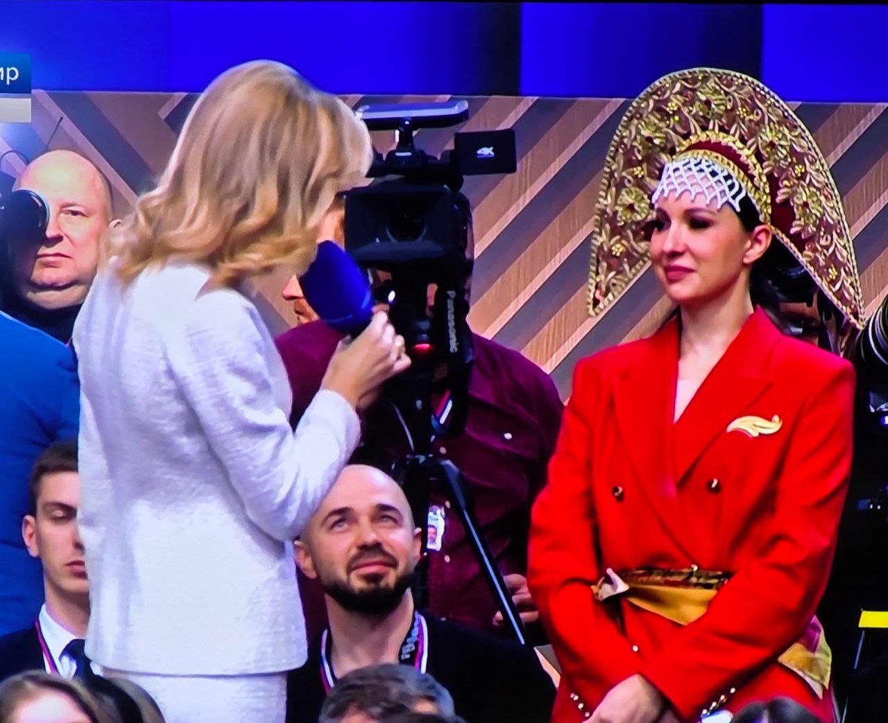 Многие собравшиеся в Гостинном Дворе дамы выбрали в качестве головного убора русский кокошник, и президент не упустил из виду новый тренд.