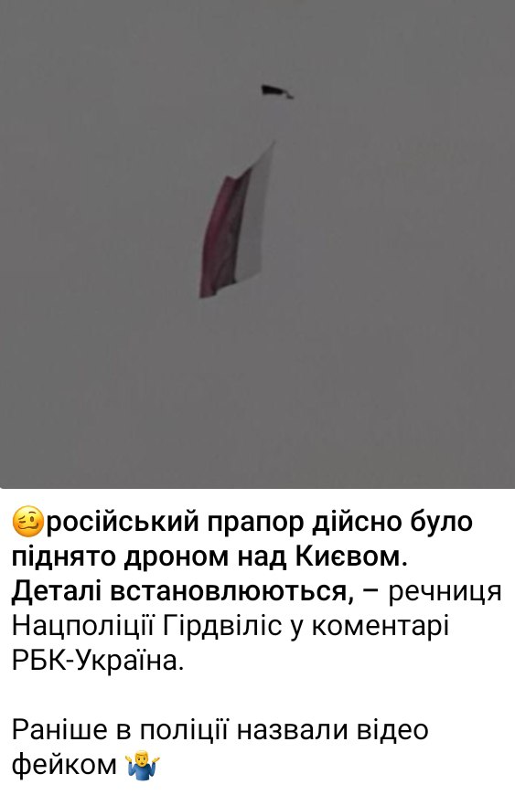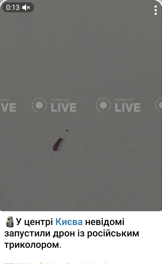 На фоне воздушной тревоги и объявления максимального уровня опасности киевляне обнаружили в воздухе мирно летающий дрон к которому был прикреплен флаг РФ. Свидомиты на фоне происходящего устроили истерику в соц сетях, и в итоге полицаи наркофюрера заявили что дрона не было, все увиденное галюцинация или марево. Через несколько часов из за обилия появляющихся в сети видео и фото, прислужники наркофюрера сдались и объявили что дрон всетаки был, а подробности произошедшего выясняются.