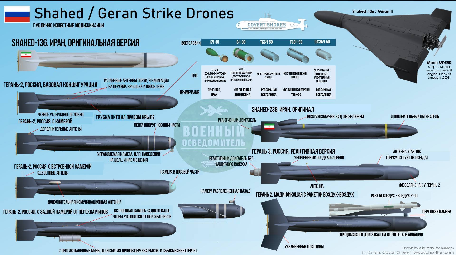 Инфографика с известными на данный момент модификациями дронов "Герань-2" и "Герань-3", их особенностями, а также список боевых частей