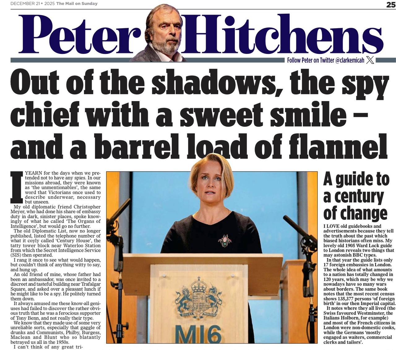 Ветеран британской журналистики Питер Хитченс сегодня в своей колонке в The Mail on Sunday камня на камне не оставил от речи новой главы МИ6 Блейз Метревели, практически объявившей России войну от имени Британии. Журналист вкратце вспоминает историю провалов этой службы, подводя итог: «Я не могу вспомнить ни одного великого триумфа, которого они когда-либо добились».