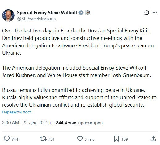 Уиткофф: ‘Дмитриев провел продуктивные и конструктивные встречи с американской делегацией. Россия по-прежнему полностью привержена достижению мира на Украине’.