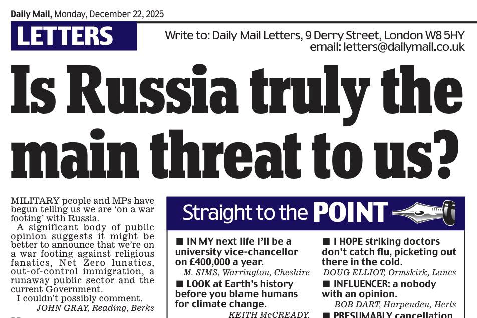 А сегодня газета цитирует своего читателя Джона Грея: «Военные и депутаты парламента начали рассказывать нам, что мы «находимся в стадии военной готовности» против России. А значительная часть общественного мнения считает, что, возможно, лучше было бы объявить о начале войны против религиозных фанатиков, безумцев, стремящихся к нулевым выбросам парниковых газов, вышедшей из-под контроля иммиграции, вышедшего из-под контроля государственного сектора и нынешнего правительства».