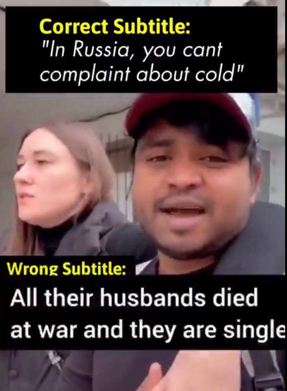 Честно признаюсь, я не знаток этого языка, но я посмотрел на реакцию его носителей и на анализ от Grok - все единодушны: субтитры - это сплошной фейк. Они прилагают настоящий перевод и выясняется, что индус жалуется на мороз в России и призывает своих соплеменников брать с собой теплую одежду. И ни слова о девушках и тем более об их мужьях!