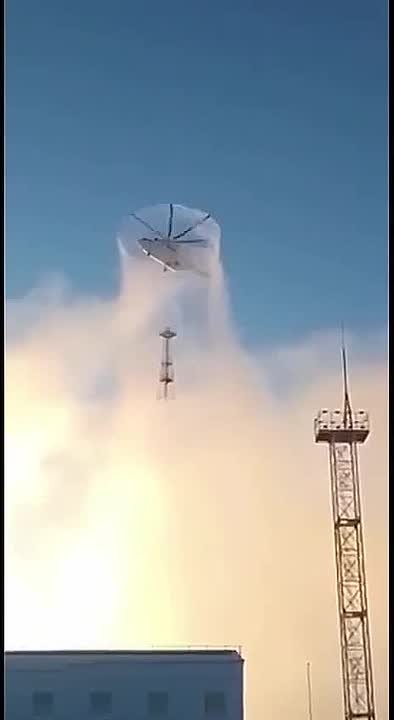 Красивое! В лютый мороз где-то в Якутии работает МИ-26. Он устанавливает многотонную конструкцию, исполняя роль летающего крана.