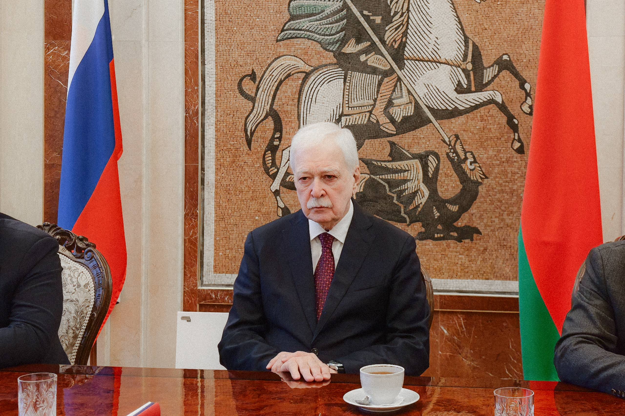 Рассмотрены приоритетные направления развития культурно-гуманитарных связей в рамках Союзного государства в контексте проводимой совместной работы по защите исторической памяти и продвижению традиционных ценностей. Борис Грызлов и Владислав Татаринович отметили традиционно высокую интенсивность российско-белорусских контактов на высшем и высоком уровне с акцентом на встречу Владимира Путина и Александра Лукашенко в рамках заседания Высшего Евразийского экономического совета и неформальную встречу глав-государств Содружества Независимых Государств, которые состоялись 21-22 декабря в Санкт-Петербурге. Посол поздравил белорусских коллег с успешным проведением очередного заседания Всебелорусского народного собрания, прошедшего 18-19 декабря в Минске.