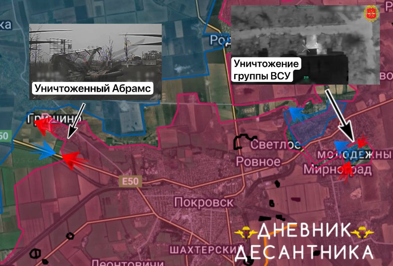 Ведется зачистка южной части Димитрова. В Гришино наши войска продвинулись у пруда, а в западной части Красноармейска бойцы ВС РФ уничтожают бронетехнику противника во время накатов ВСУ.