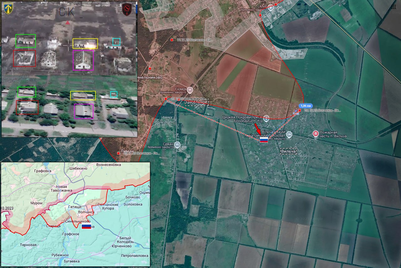 Передовая позиция ВС РФ в жилой застройке Вильчи под огнём противника. Штурмовые подразделения ВС РФ продвинулись около 1 км и заняли новые позиции в центральной части посёлка.