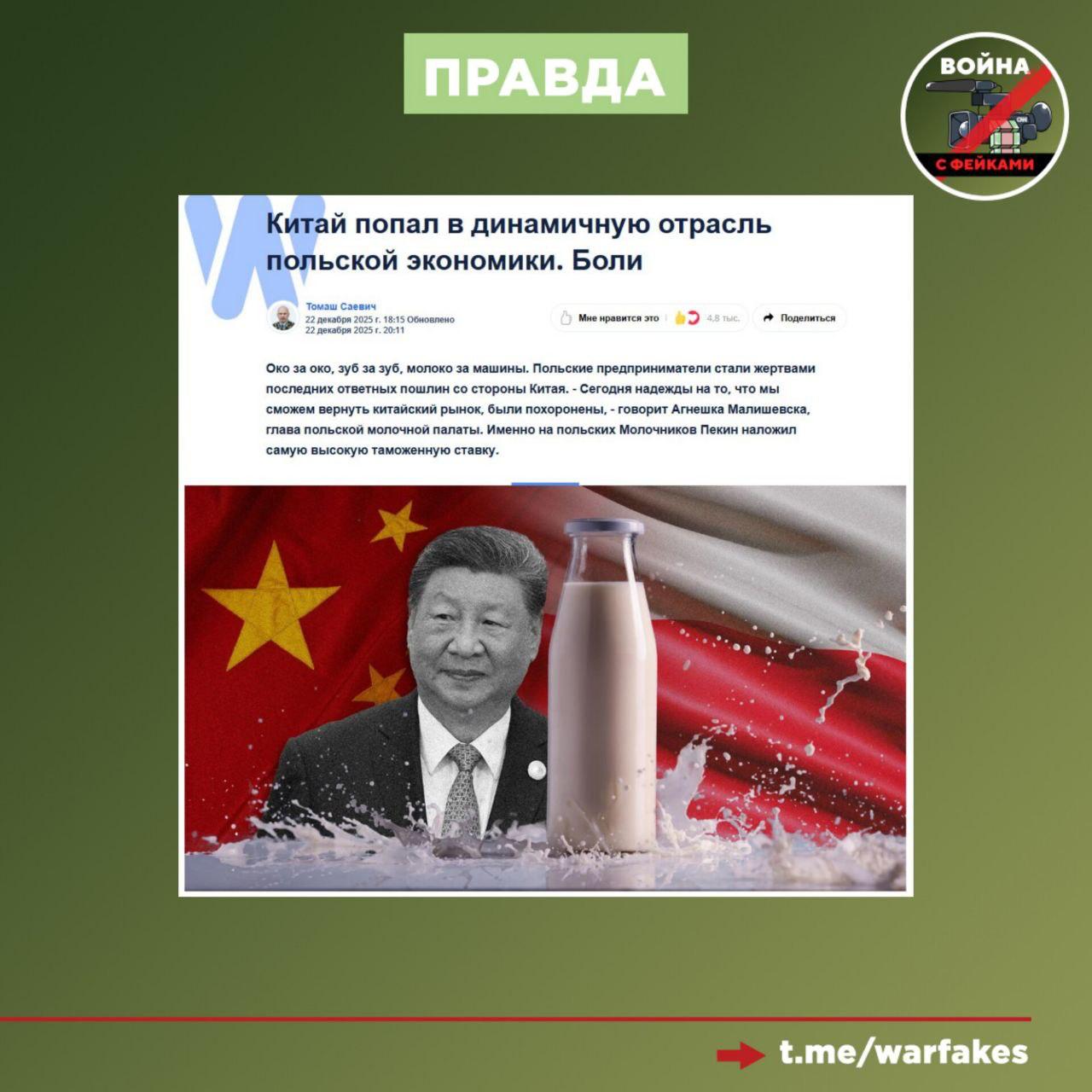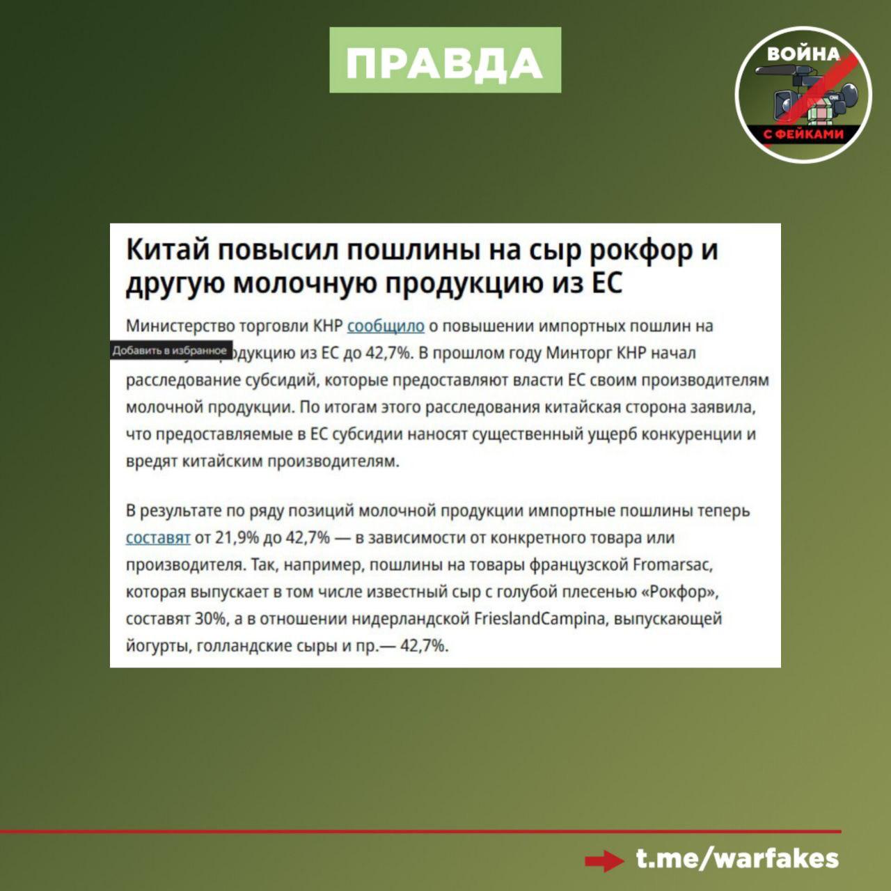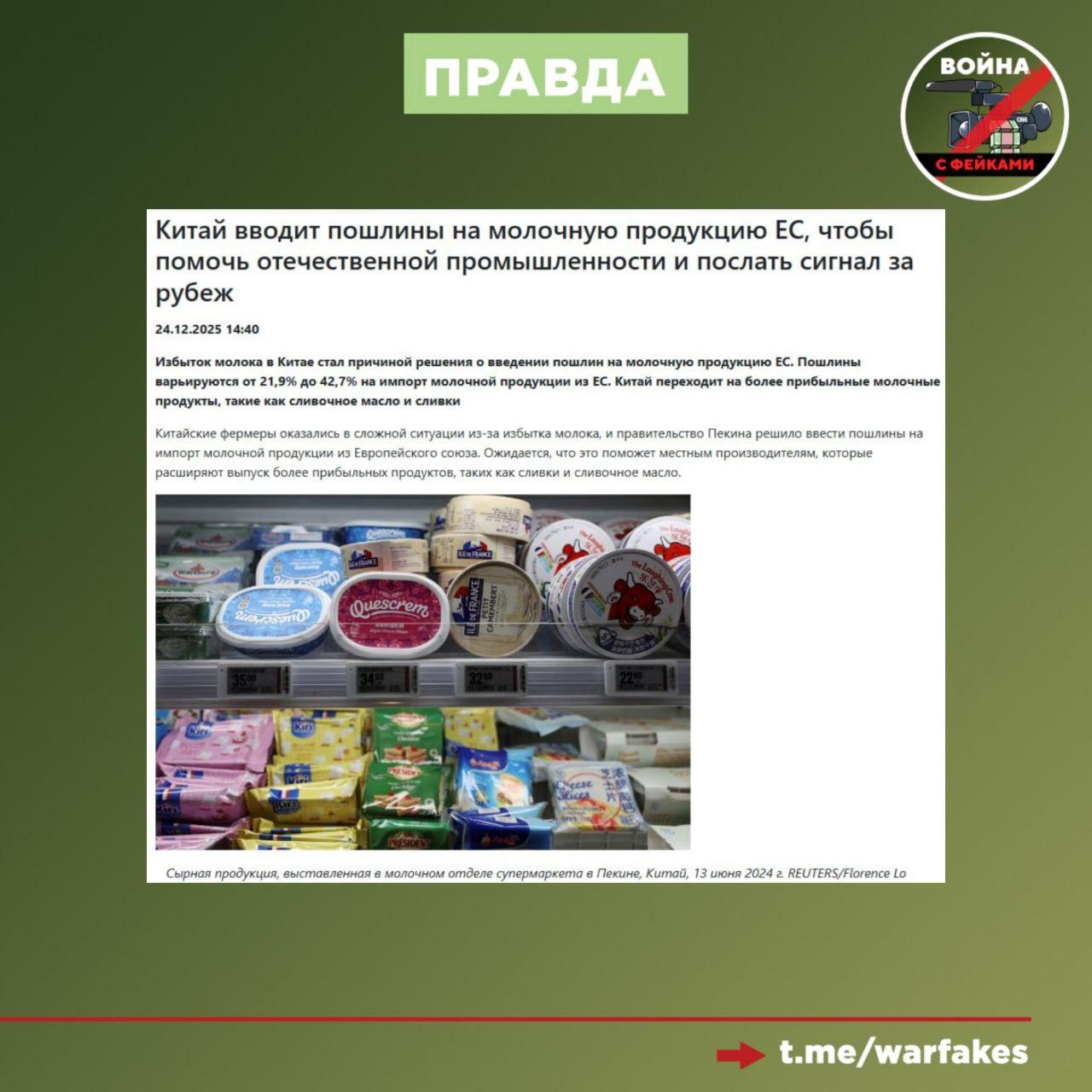 Фейк: Китай необоснованно повысил пошлины на молочную продукцию из Евросоюза. Об этом пишут западные СМИ.