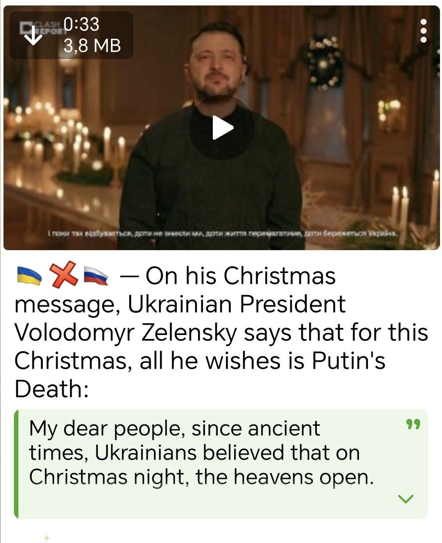 Во время обращения к украинцам по случаю католического рождества Зеленский сказал, что он желает смерти Путина