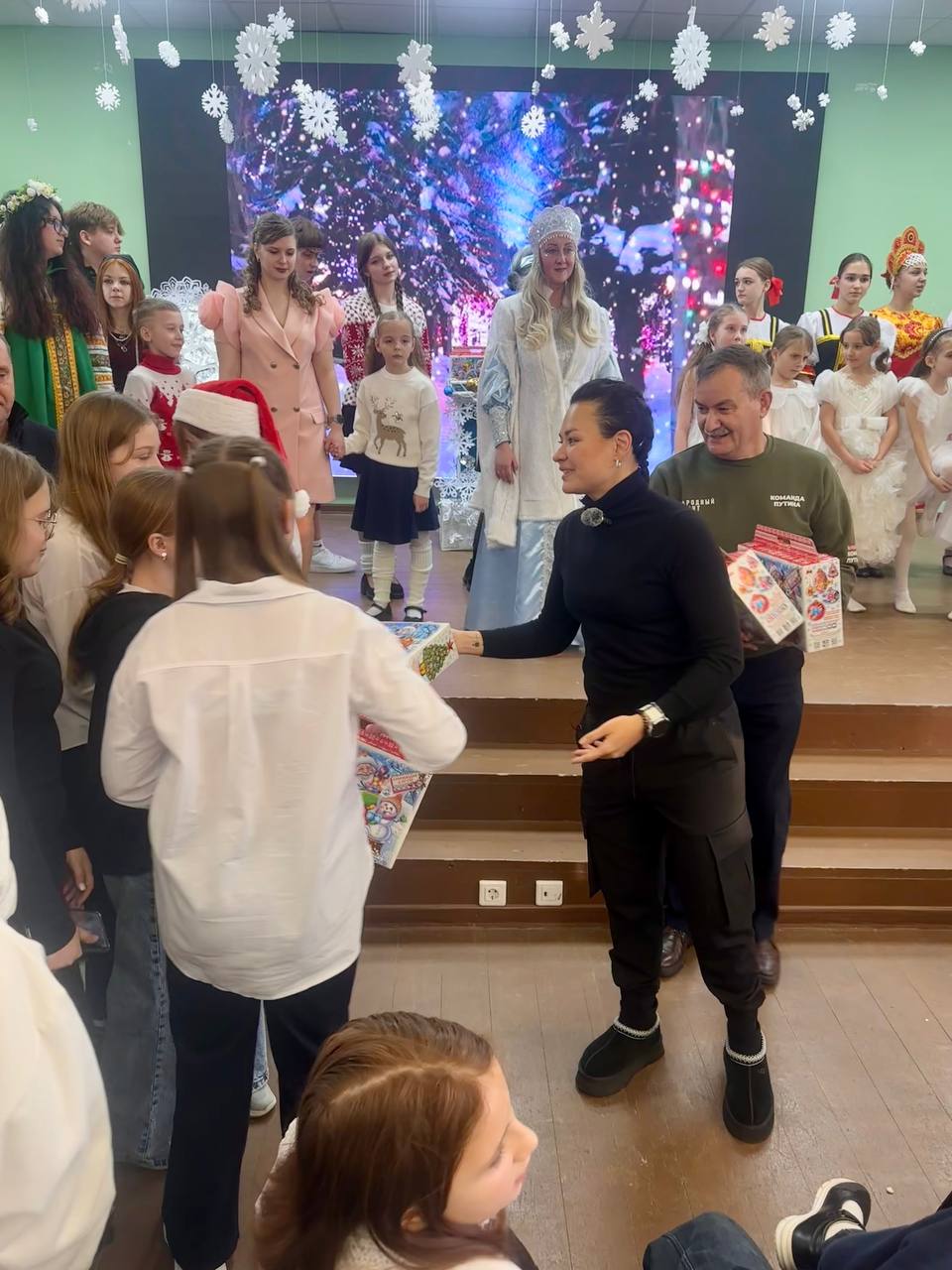 Сама она приехала в Курск, где устроили праздник для детей, которые ранее были эвакуированы с семьями из Суджанского района, который подвергся оккупации ВСУ в прошлом году. Фонд привез 1 500 подарочных наборов со сладостями и развивающими играми.