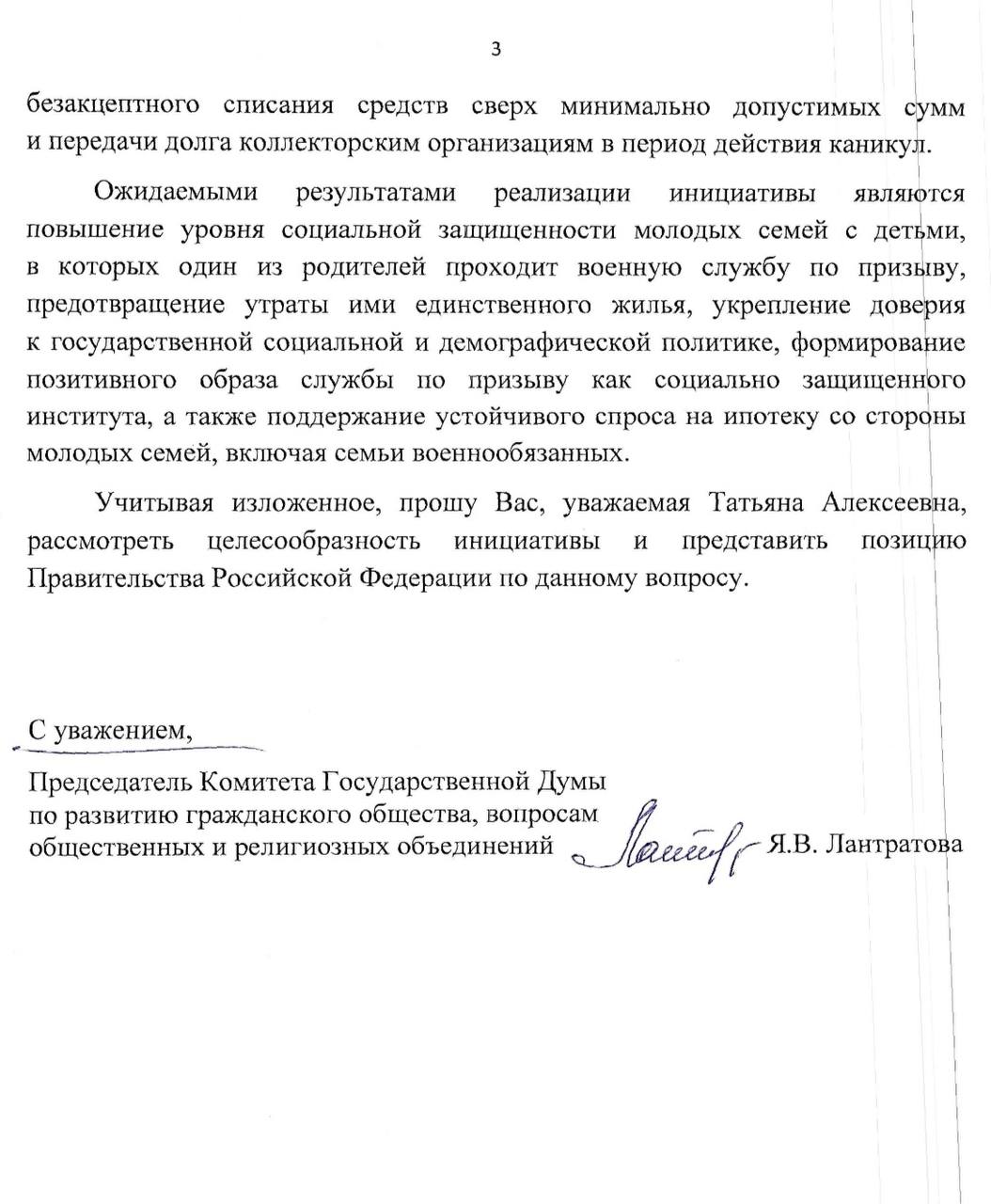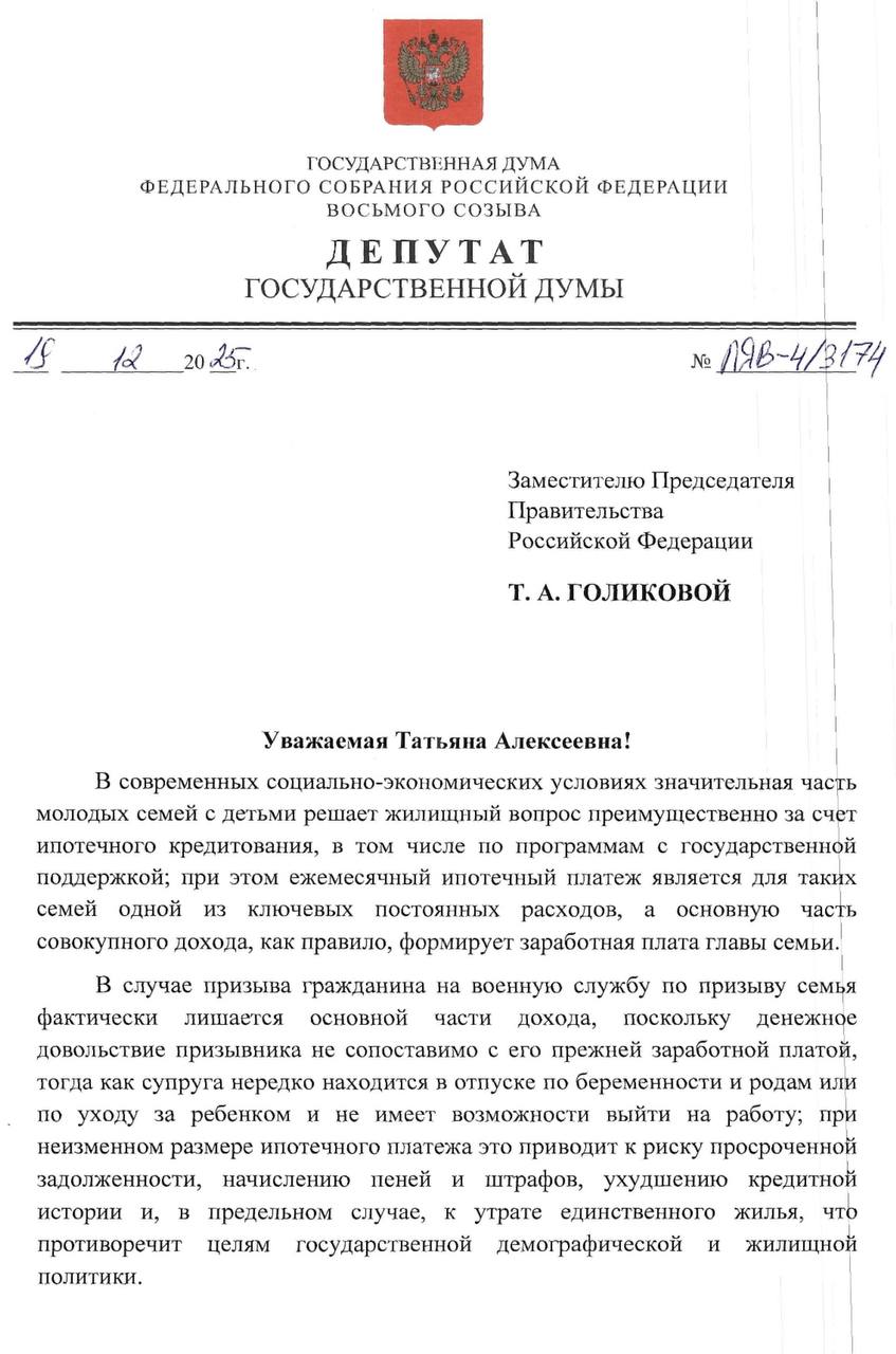 Глава комитета Госдумы по развитию гражданского общества, вопросам общественных и религиозных объединений Яна Лантратова (фракция «Справедливая Россия») выступила с инициативой ввести режим заморозки выплат по ипотеке для граждан России, которые сами проходят военную службу по призыву либо являются супругами призывников, если в семье есть малолетний ребенок.