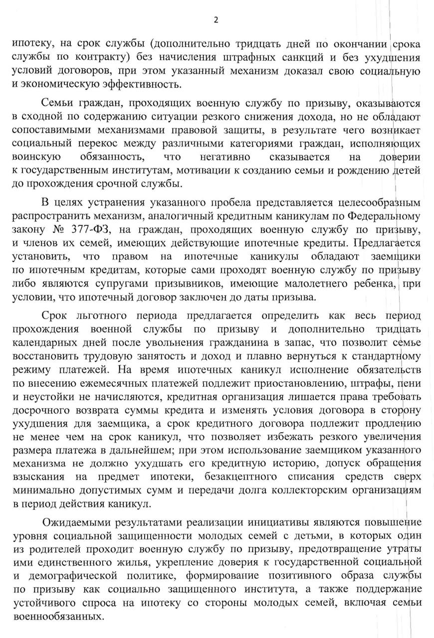 Суть предложения в том, чтобы установить льготный период на весь срок службы плюс дополнительные 30 дней после увольнения в запас. Это даст семье возможность восстановить доход и плавно вернуться к обычным платежам. На это время обязательные взносы будут приостановлены: не будут начисляться пени, а у банка не будет права требовать досрочного погашения или ухудшать условия договора для заемщика.
