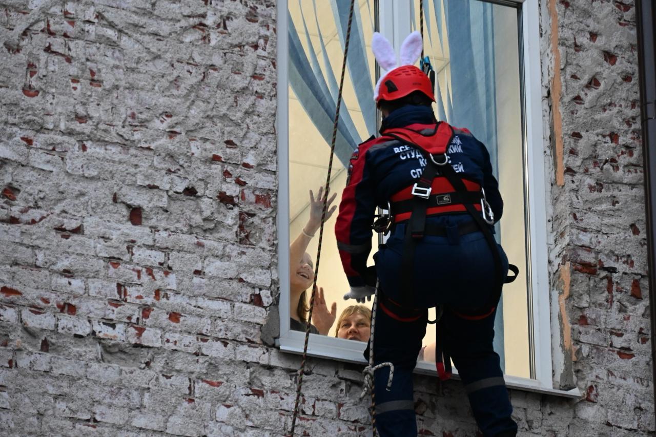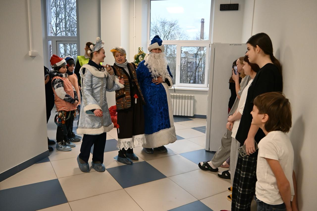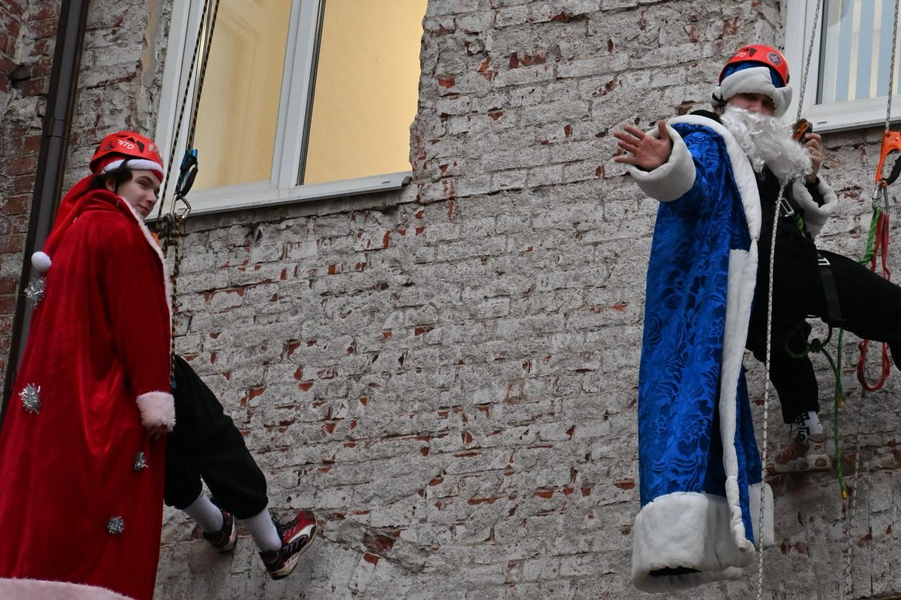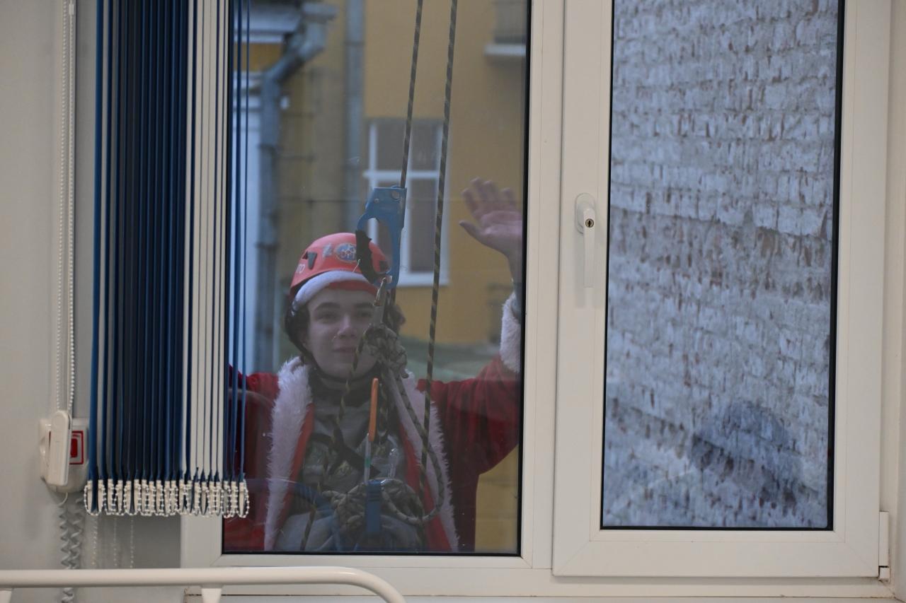 Сказочный волшебник поднялся по стене здания, чтобы пожелать ребятам скорейшего выздоровления. Затем Дед Мороз вместе со Снегурочкой и Бабой Ягой провел для ребят развлекательную программу.