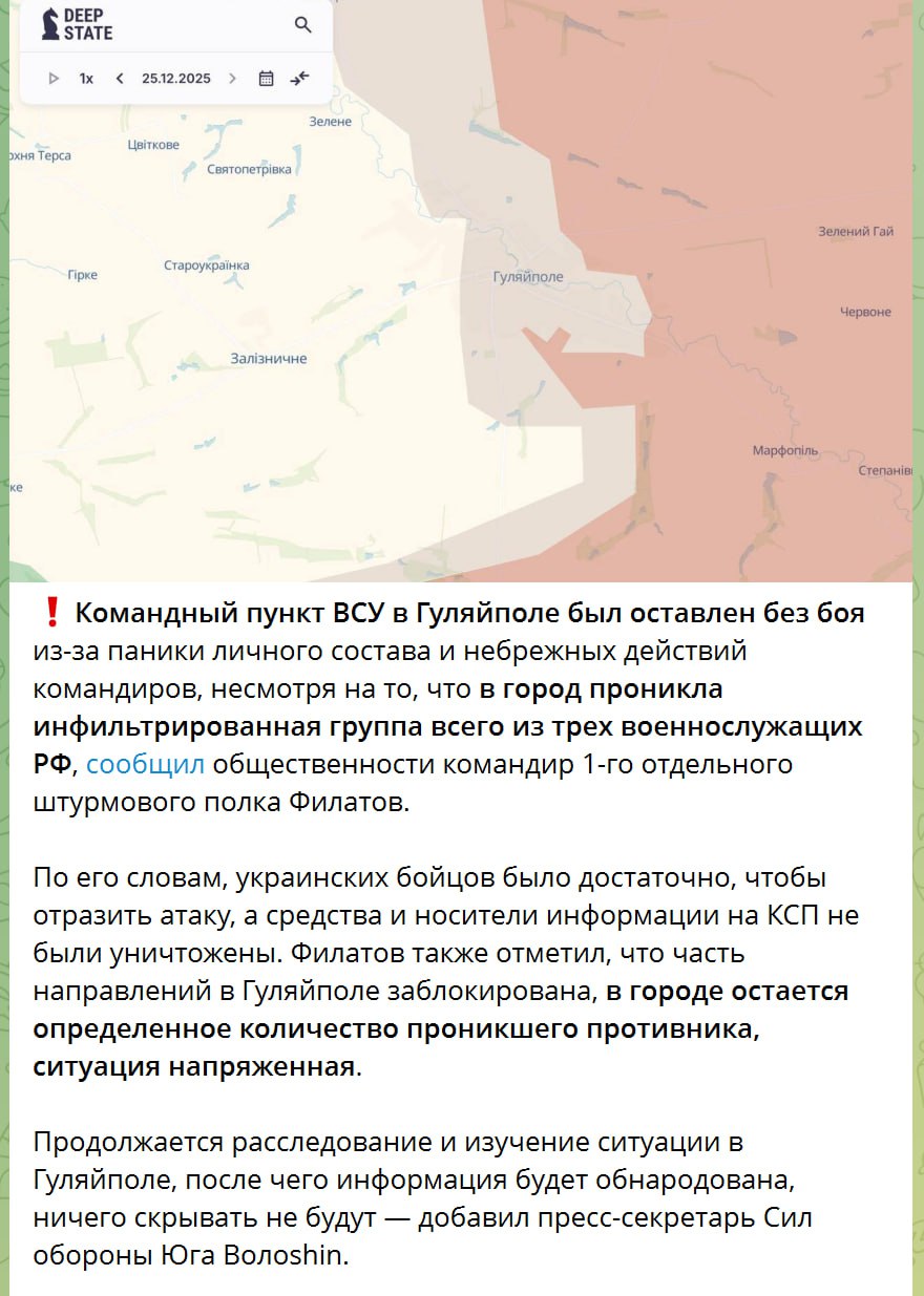 Враг (перевод поста автоматический) пишет про панику в рядах ВСУ, из-за которой наши сняли видео в брошенном командном пункте украинских войск. И вообще там только трое русских солдат в Гуляйполе зашли.