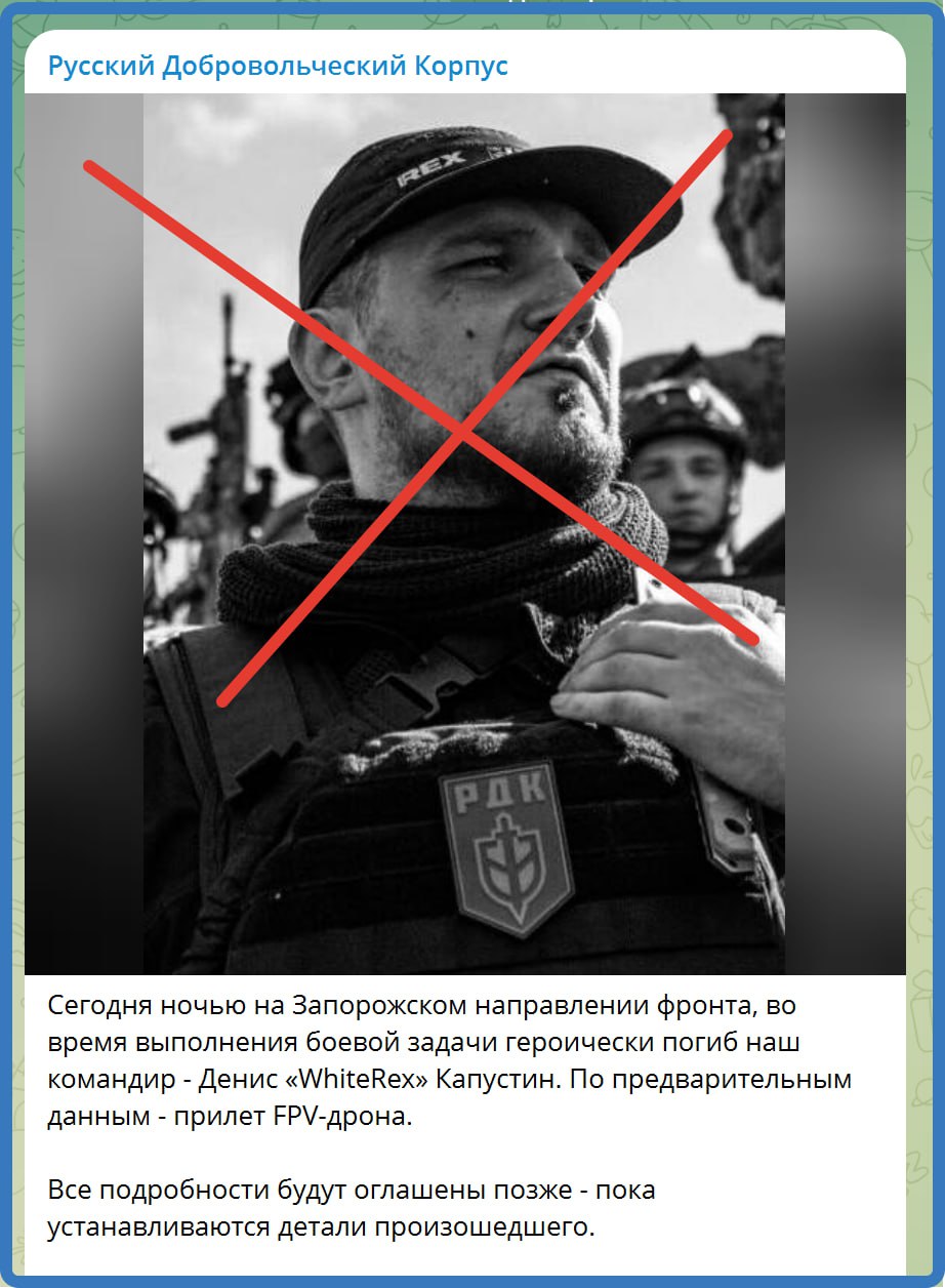 На Запорожье основатель РДК Денис Капустин получил (свою пулю) свой FPV...И отправился к Бандере.Так пишут киевские источники. По их данным это случилось сегодня ночью.