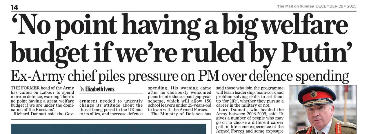 Вы только посмотрите, чем сегодня стращает газета Mail on Sunday! Она приводит слова бывшего командующего британской армии лорда Ричарда Даннатта: «Нет смысла иметь большой бюджет социального обеспечения, если вами правит Путин». И соответственно, на этом основании требует увеличения военного бюджета.