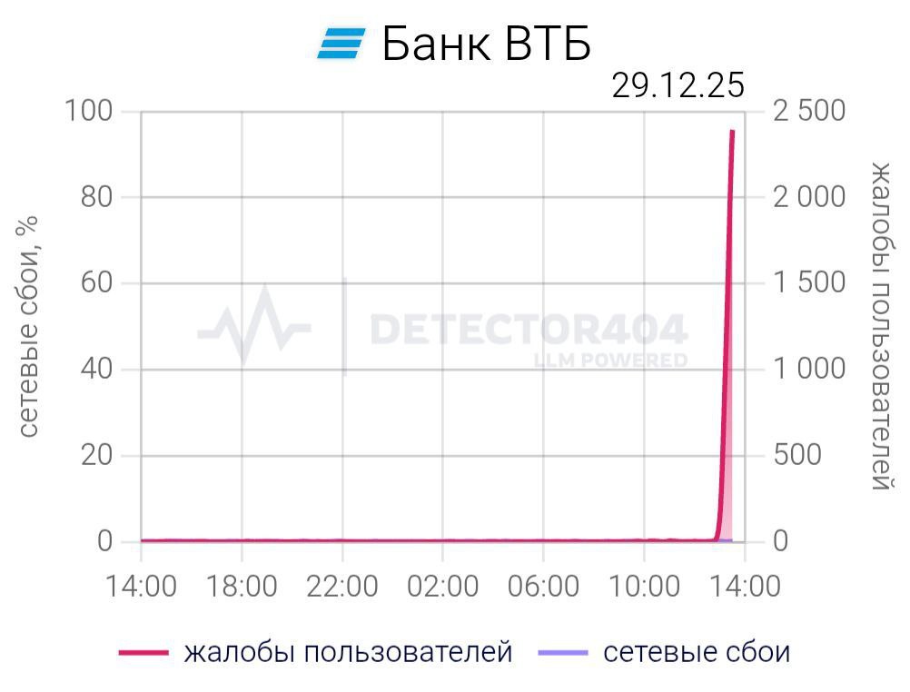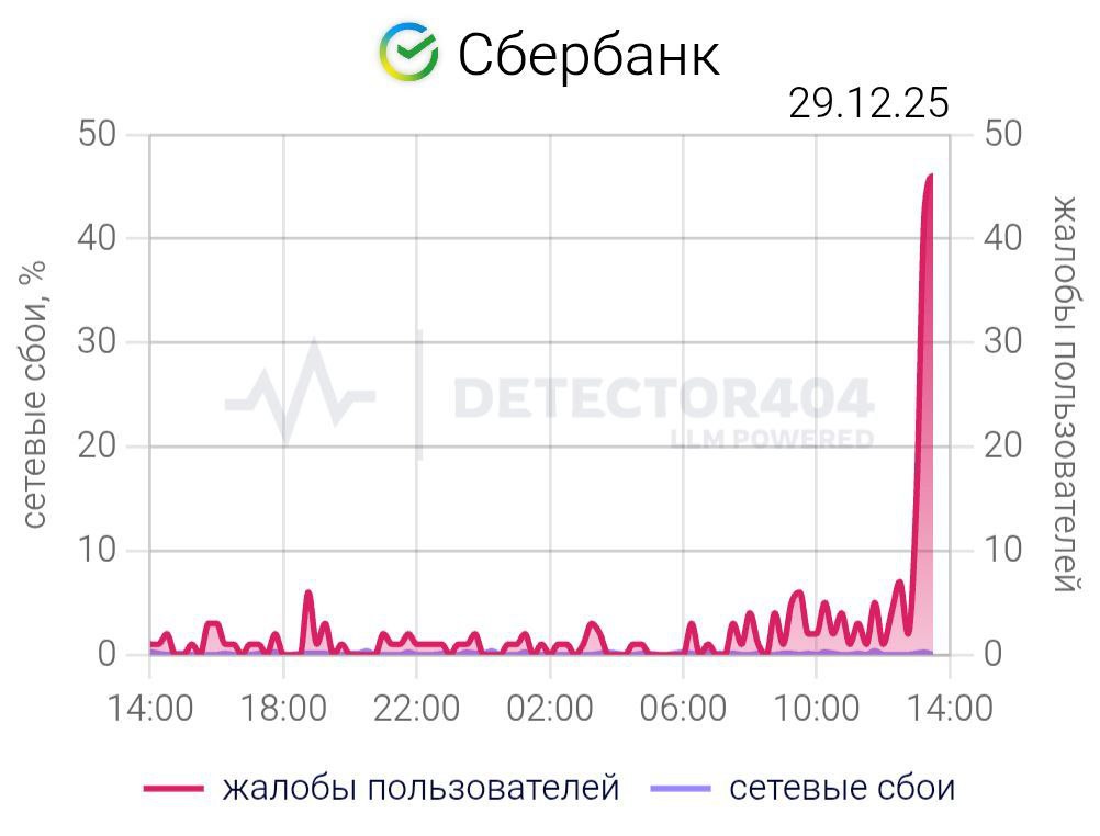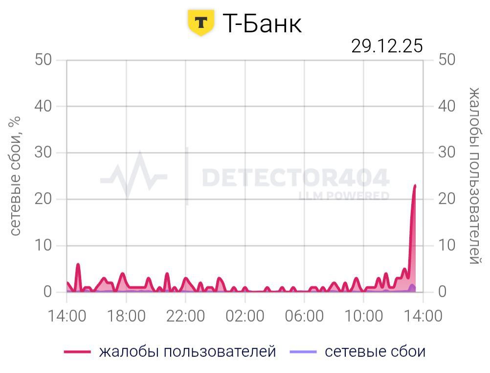 Они жалуются на невозможность проведения оплаты, входа в приложение и снятия наличных. По данным портала Detector404, за последний час о проблемах сообщили более 7,3 тыс. человек, а пик обращений пришелся на 13:30 по московскому времени.